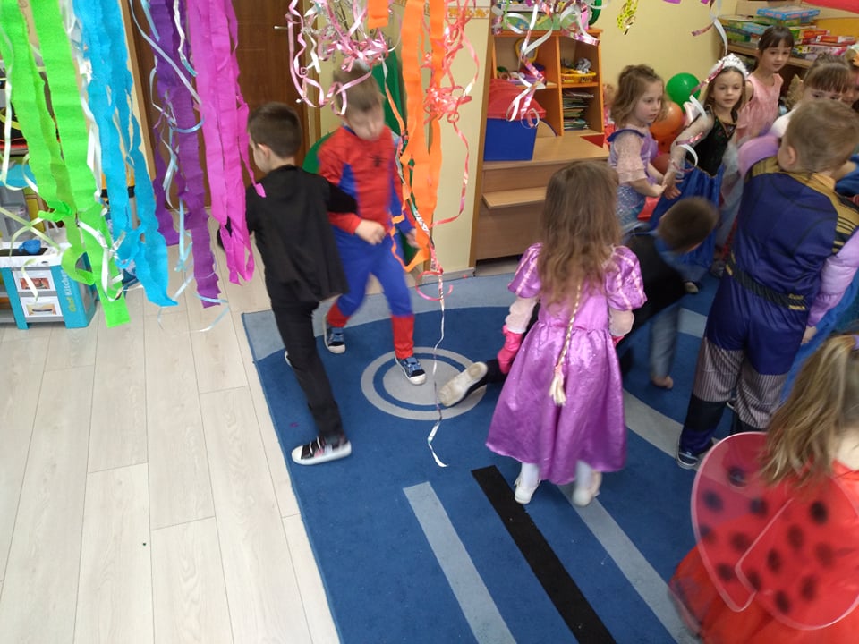 Dzieci świetnie się bawiły uczestnicząc wspólnie ze swoimi paniami w zabawach i pląsach. W sali w czasie tańców było bardzo kolorowo, wszyscy bawili się wesoło, uśmiech nie znikał z twarzy mimo chwilowego zmęczenia.