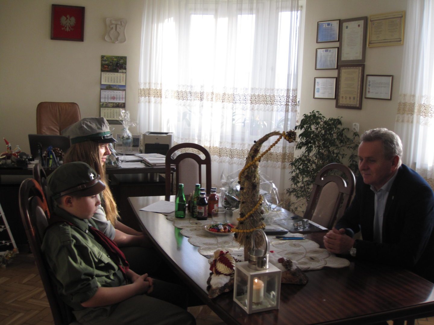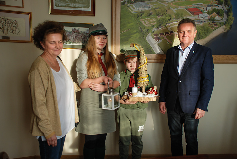 19 grudnia do Urzędu Miejskiego w Pińczowie wybrali się przedstawiciele naszej drużyny harcerskiej: Magda Szydłowska i Paweł Jachna wraz z druhną Anną Zacharz. Harcerze przekazali Burmistrzowi Miasta i Gminy Pińczów p. Włodzimierzowi Badurak Betlejemskie Światełko Pokoju oraz wręczyli własnoręcznie wykonany stroik świąteczny. Następnego dnia harcerze odwiedzili proboszcza Parafii Ducha Świętego i Matki Bożej Bolesnej w Młodzawach Małych ks. Jana Tokarczyka, któremu także przekazali światełko. Oczywiście przy okazji tych spotkań nie mogło zabraknąć ciepłych słów i życzeń z okazji zbliżających się Świąt Bożego Narodzenia.