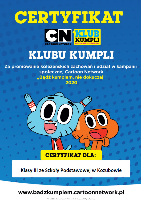 W ramach kampanii społecznej „Bądź kumplem, nie dokuczaj” Cartoon Network nasza szkoła promuje ideę życzliwości oraz koleżeńskie postawy. Do Klubu Kumpla dołączyły kolejne klasy: I, II i III. Uczniowie otrzymali od organizatorów Certyfikat Klubu Kumpla za promowanie koleżeńskich zachowań i udział w kampanii.