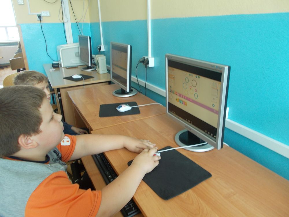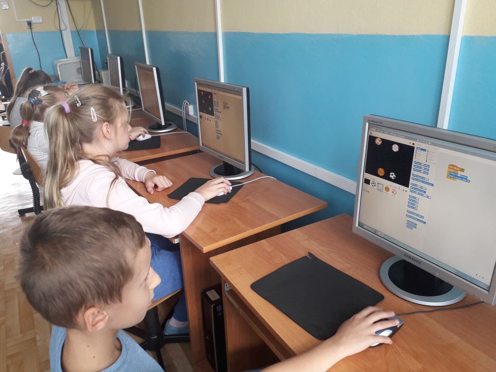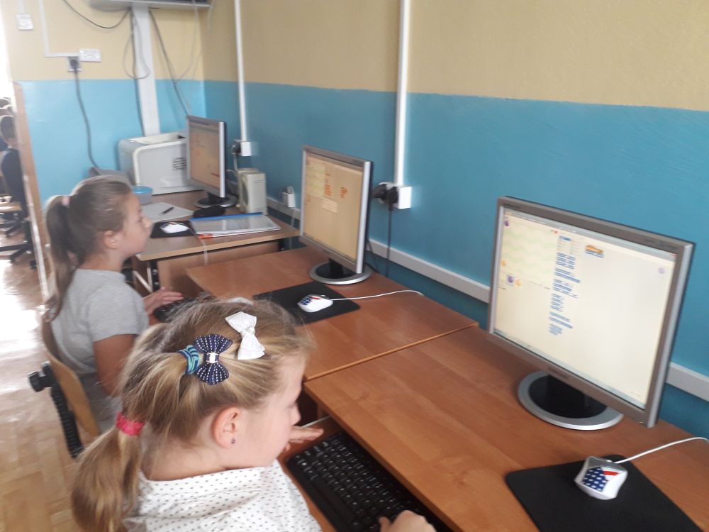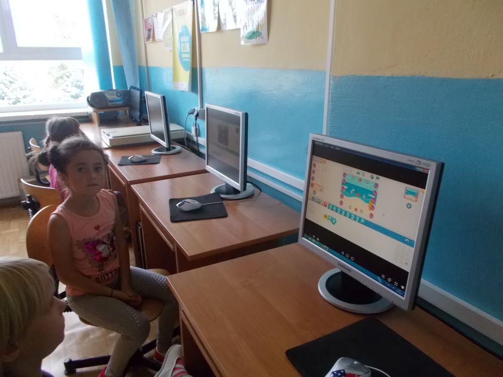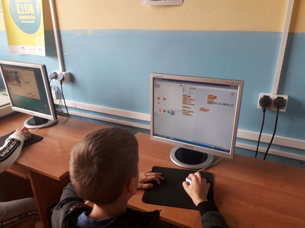 Klasa III programowała przy pomocy Scratcha. Zadaniem dzieci było zaprogramowanie tak kropeczki, aby pojawiała się losowo na planszy, a gracz miał możliwość uzyskiwania punktów. W tym dniu, nikt nie był „ w kropce”, za to wszyscy byli „zakropkowani”. Podczas wspólnej zabawy, zwracając uwagę na to, że każdy ma jakiś talent, wystarczy tylko w siebie uwierzyć uczniowie świetnie się bawili.
