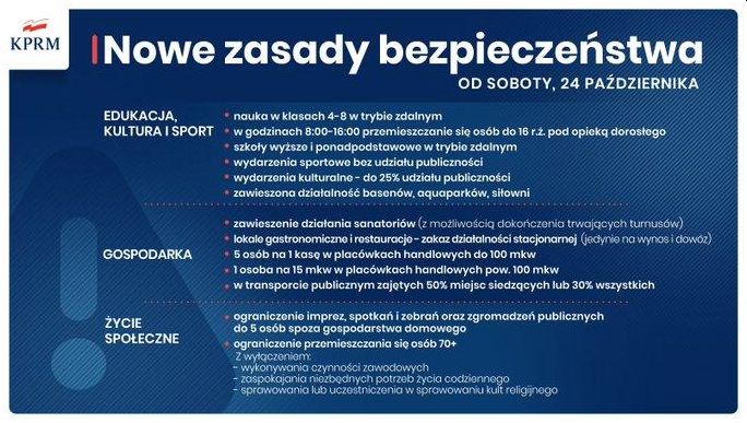 Od soboty 24 października 2020 r. cała Polska zostaje objęta „czerwoną” strefą. W związku z tym Rząd wprowadza nowe obostrzenia: