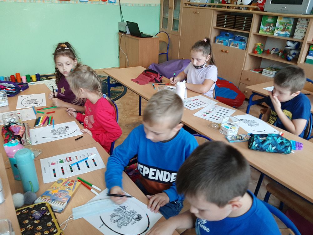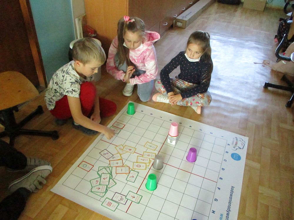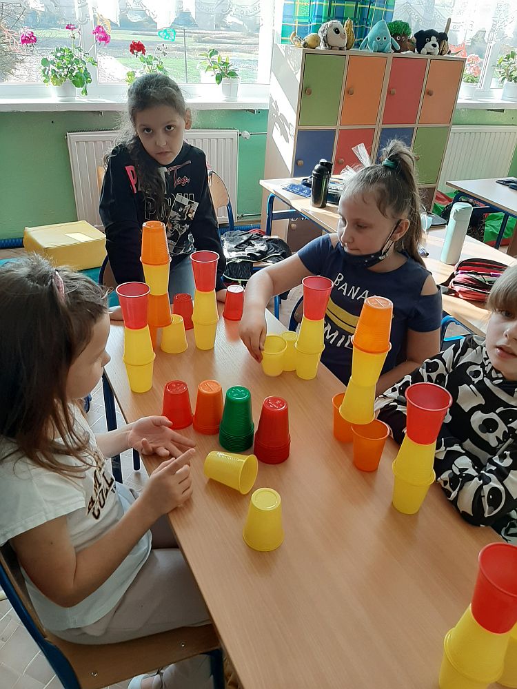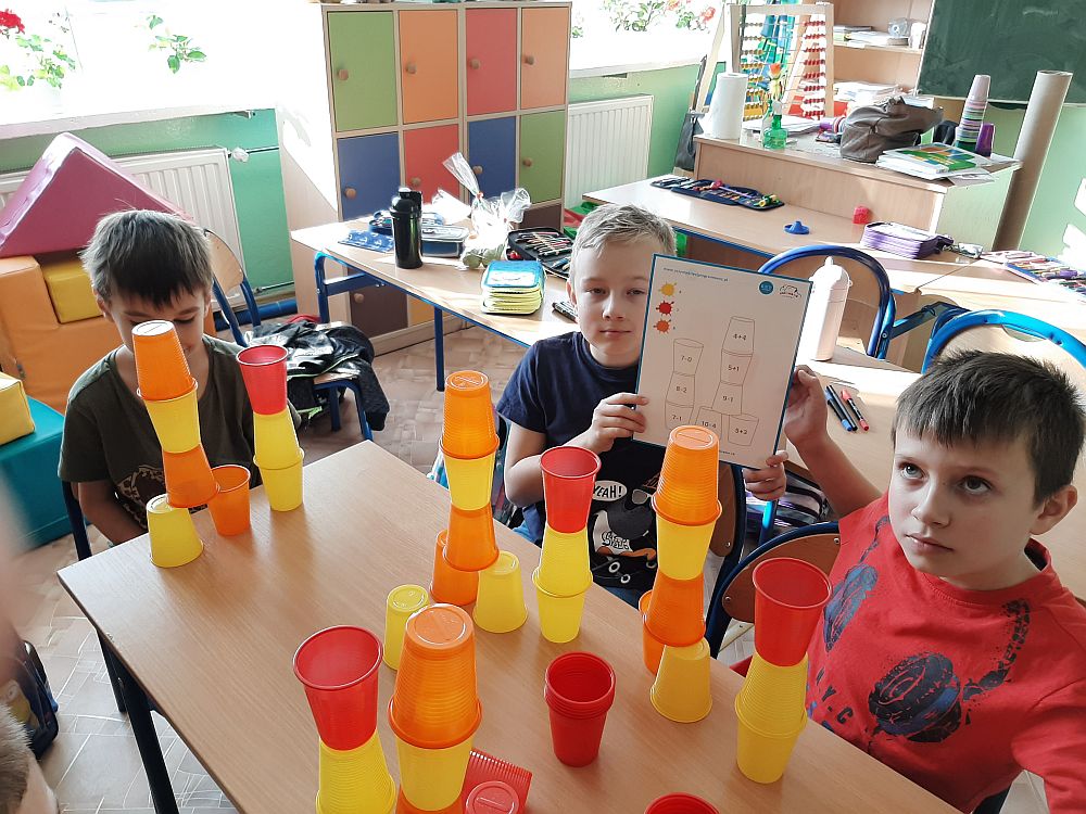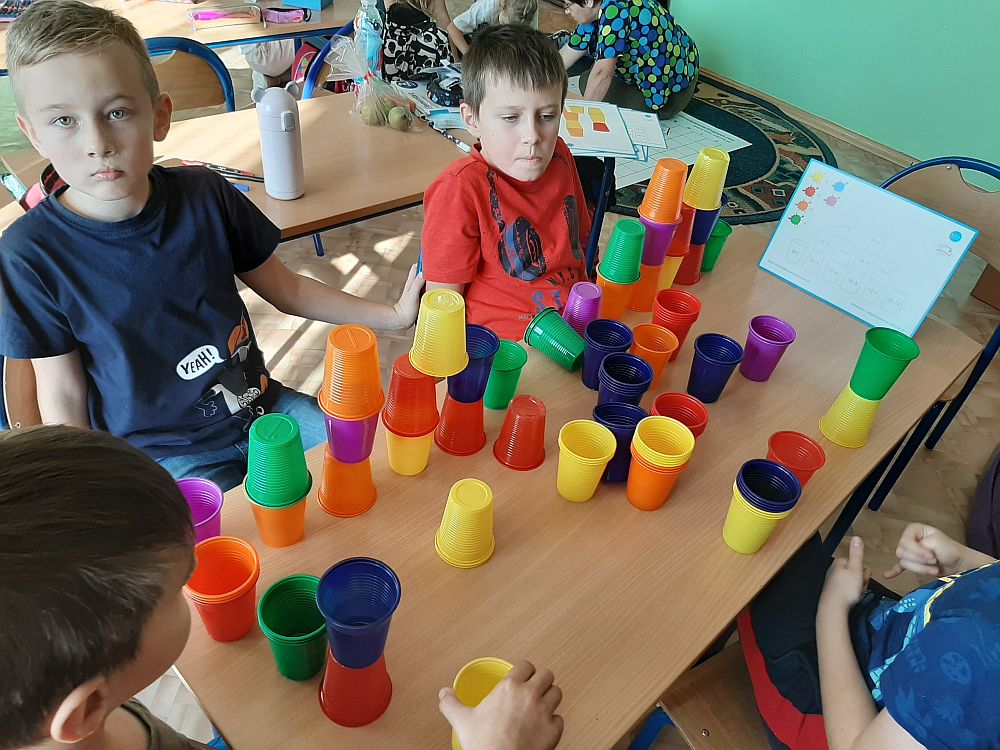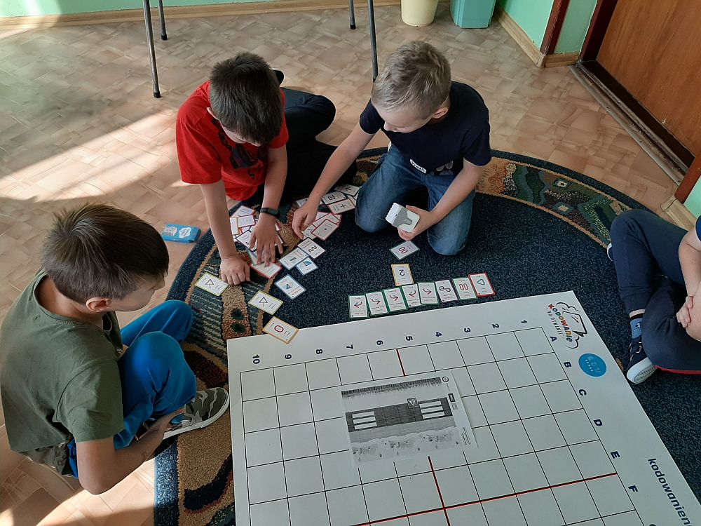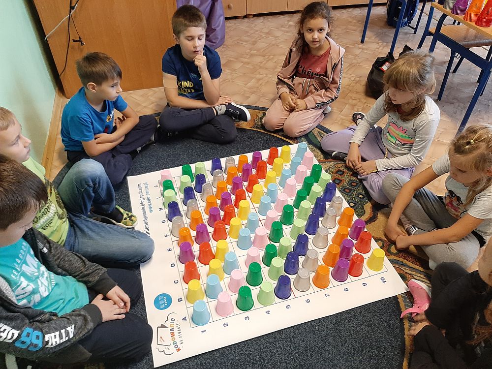 Uczniowie klasy II swoje zajęcia w ramach projektu „Bezpiecznie zaprogramowani” rozpoczęli od ćwiczeń na macie od kodowania. W odpowiednich miejscach układali kolorowe kubeczki zgodnie z warunkami. Ćwiczenia z użyciem kolorowych kubeczków wpływają na wyobraźnię przestrzenną, znajomość kierunków i orientację w terenie. Pomagają ćwiczyć koncentrację i skupienie uwagi oraz aktywizują uczniów, dając im szerszy obraz przestrzenny oraz pole widzenia w planowaniu ruchów. Zadania bardzo zaciekawiły uczniów i z niecierpliwością czekały na następne.