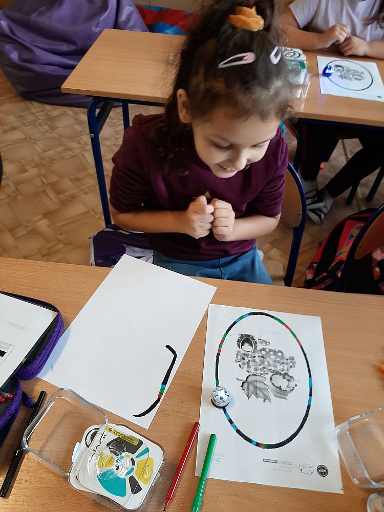 Na kolejnych zajęciach w ramach tego projektu dzieci testowały Ozoboty, które można programować z użyciem jedynie kredek lub flamastrów. Ozobot to mały, ale bardzo inteligentny robot – zwinny, prosty, intuicyjny. Rysując trasy dla ozobotów i stosując proste kolorowe kody dzieci rozwijały różne kompetencje, takie jak myślenie algorytmiczne, szukanie optymalnych rozwiązań, kreatywność.