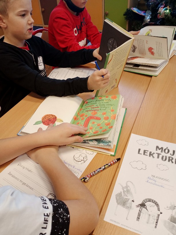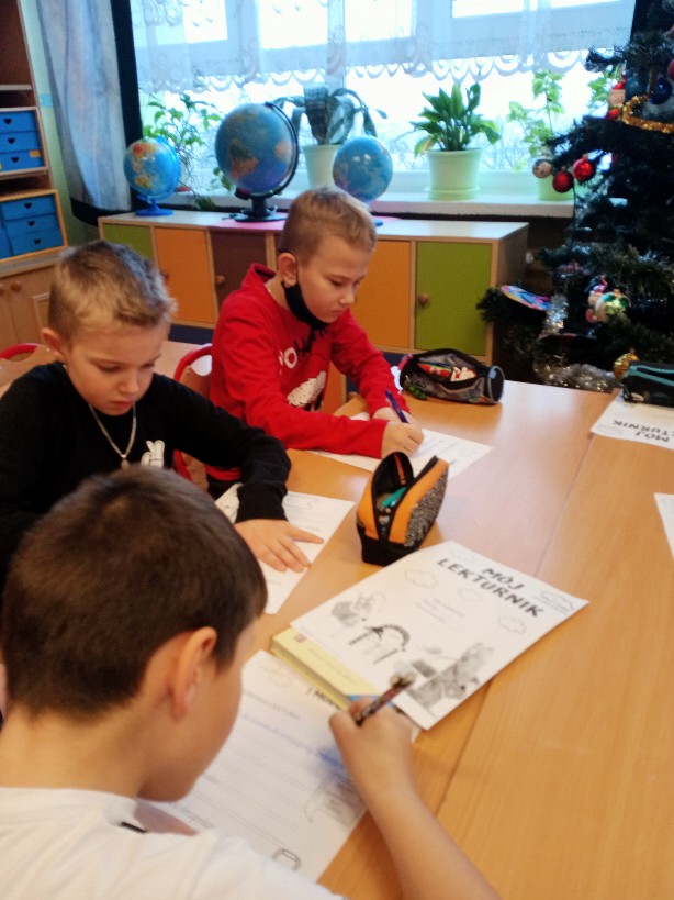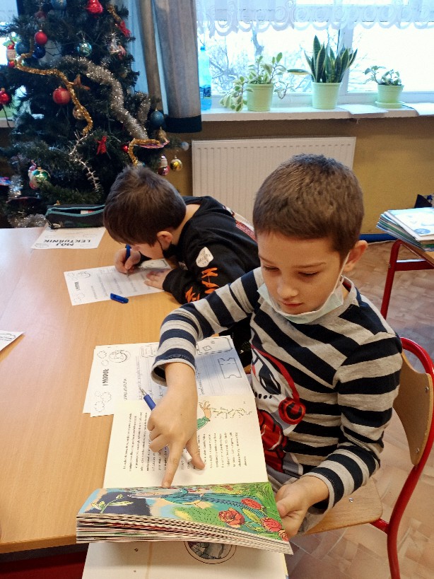Przez cały listopad i grudzień uzupełniali swoje lekturniki. Pokolorowali okładkę i uzupełnili strony związane z przeczytaną lekturą. Rysowali też wybrane skarpetki, omawiali z wychowawczynią przeczytane rozdziały.