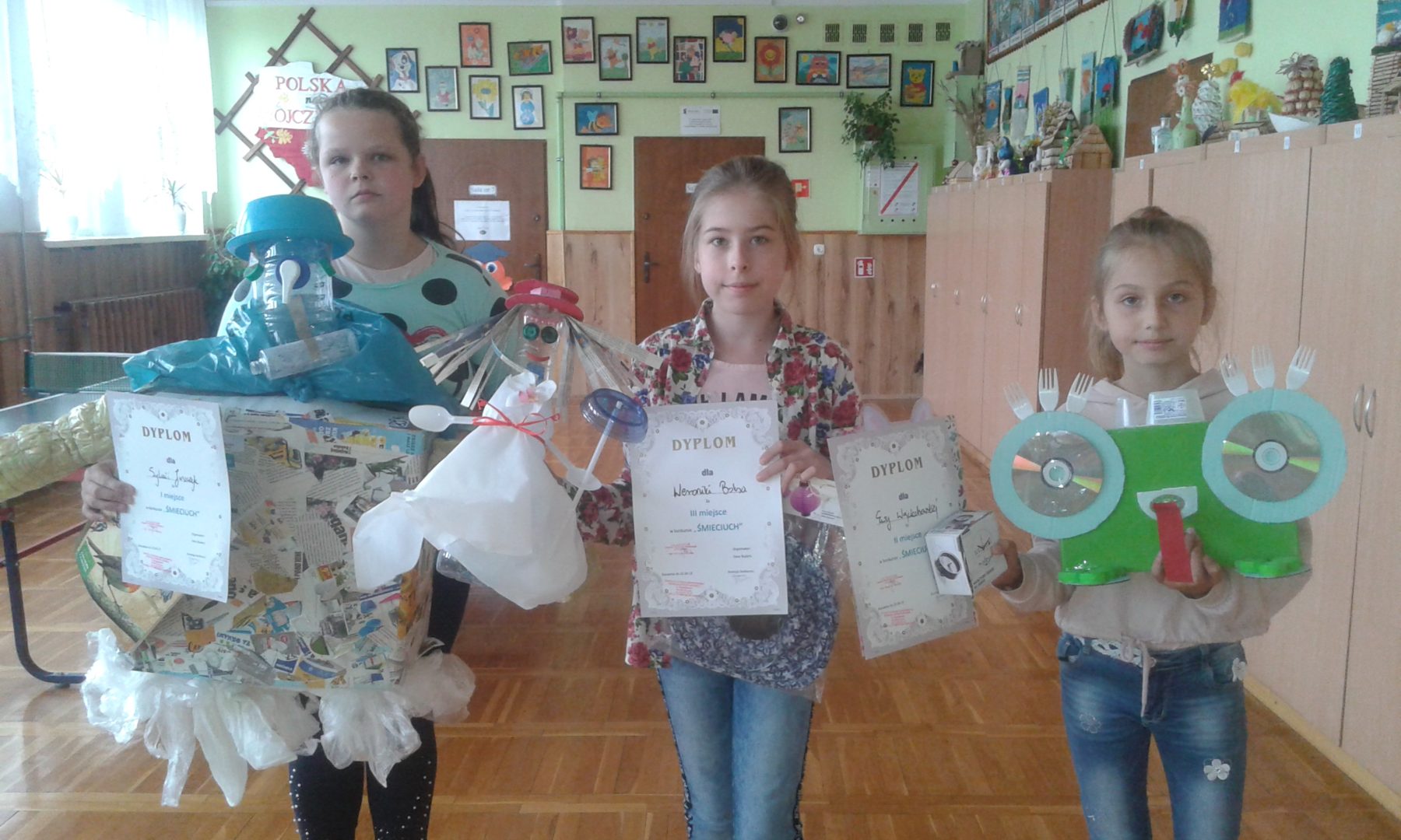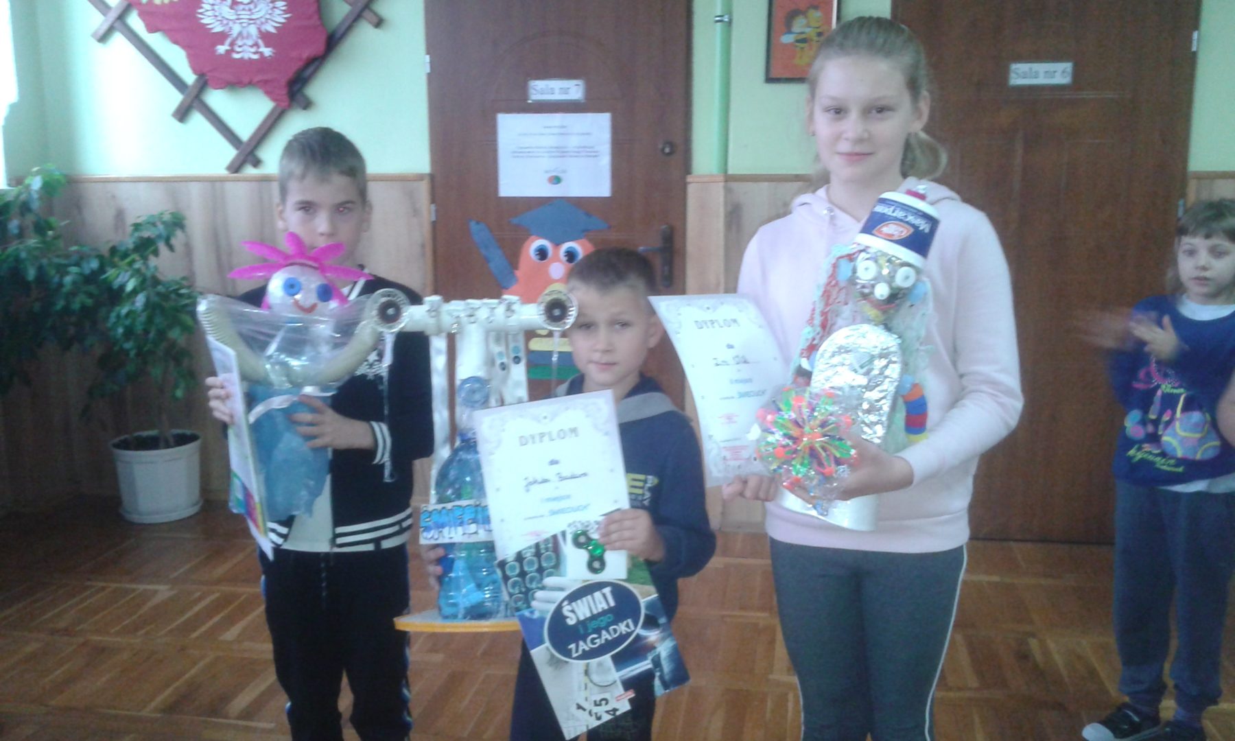 Dziś, 25. września poznaliśmy zwycięzców szkolnego konkursu ekologicznego „Ekoludek”. Celem konkursu było propagowanie i zachęcanie do podejmowania działań na rzecz ochrony środowiska, kształtowanie postaw ekologicznych, a także zabawa rozwijająca inwencje twórcze i zdolności plastyczne dzieci. Uczestnicy konkursu oceniani byli w dwóch kategoriach wiekowych: klasy I – III oraz IV – VIII. Organizator konkursu p. Ilona Budera wraz z jury: p. Eweliną Banasiewicz i p. Jolantą Markiewicz przyznała nagrody następującym uczniom: