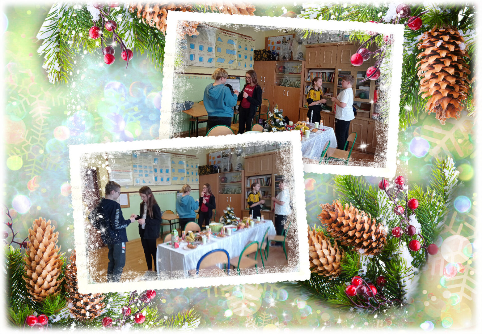 Święta Bożego Narodzenia to wyjątkowy czas w roku, kiedy konflikty odchodzą w zapomnienie, a wszyscy pragną pomagać innym. To również okres serdecznych spotkań. Właśnie z okazji zbliżających się świąt odbyło się spotkanie opłatkowe w klasie VI. Zgodnie z panującą tradycją, podzieliliśmy się opłatkiem i złożyliśmy sobie serdeczne życzenia. Później zasiedliśmy do samodzielnie przygotowanego stołu, śpiewaliśmy kolędy. To ważne, aby usiąść przy wspólnym stole, zatrzymać się na chwilę, pobyć ze sobą i życzyć sobie wszelkiej pomyślności.