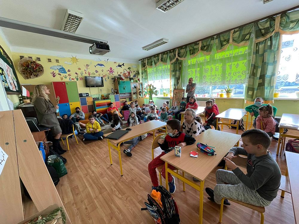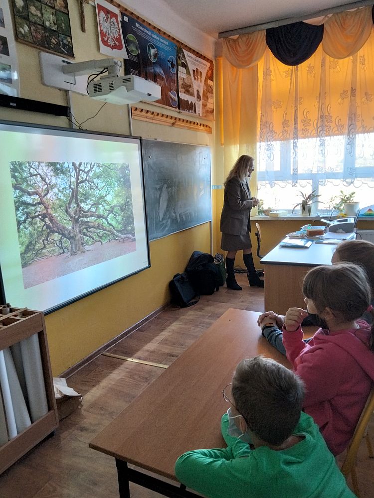 Dnia 10 października obchodzimy Dzień Drzewa. W związku z tym w naszej szkole odbyła się prelekcja dla uczniów klas 1-8 prowadzona przez przedstawiciela Świętokrzyskich i Nadnidziańskich Parków Krajobrazowych p. Magdalenę Skrzypek.  Podczas prelekcji uczniowie mogli zapoznać się w sposób przystępny i ciekawy z rodzajami i budową drzew. Nie zabrakło też ciekawostek na temat zwierząt, drzew i produktów zdrowotnych, które one wytwarzają.