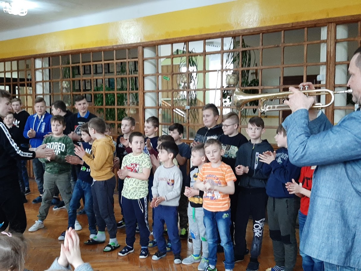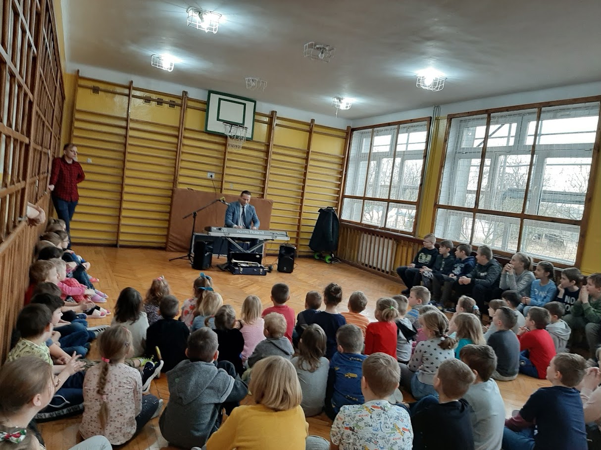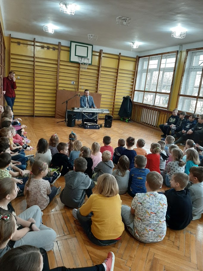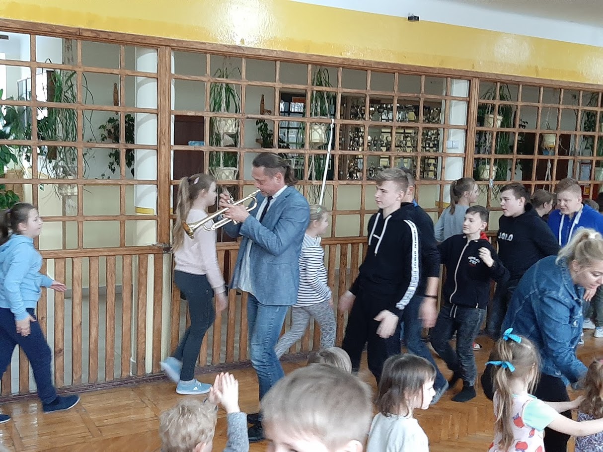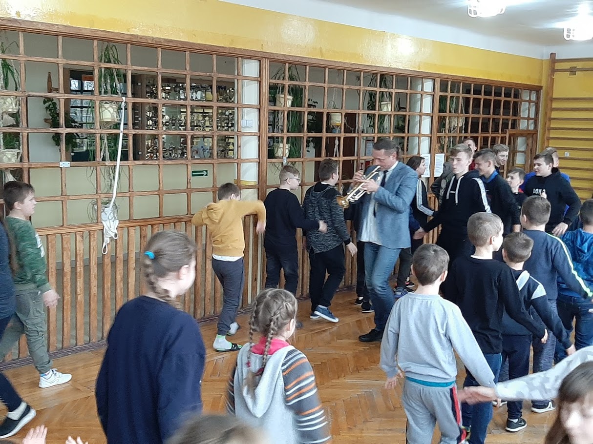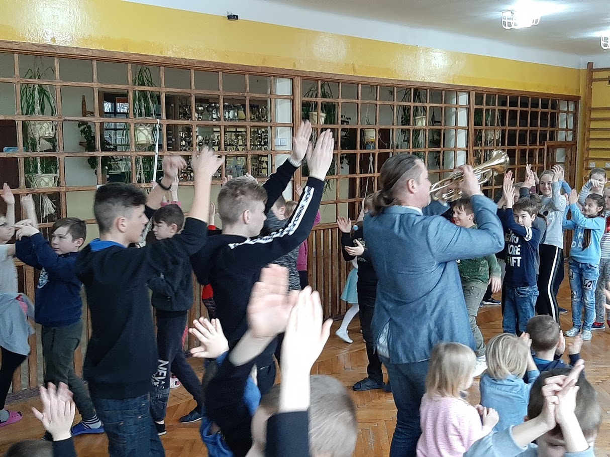 W piątek 21 lutego 2020 r. w naszej szkole odbyło się spotkanie z ,,wędrującą filharmonią”. Dobrze znany i lubiany przez uczniów muzyk, pan Marcin Jóźwik przeniósł wszystkich swoim „wehikułem czasu” w przeszłość aby zapoznać nas z historią muzyki i zaprezentować nam najbardziej znane utwory muzyków wiedeńskich. Uczniowie uważnie słuchali wykonywanych na trąbce i keyboardzie utworów, chętnie wykonywali polecenia prowadzącego, prawidłowo współpracowali ze sobą w parach ilustrując muzykę ruchem oraz w grupach ćwicząc różne techniki relaksacyjne a także biorąc udział w zabawach rytmicznych, które szczególnie spodobały się najmłodszym