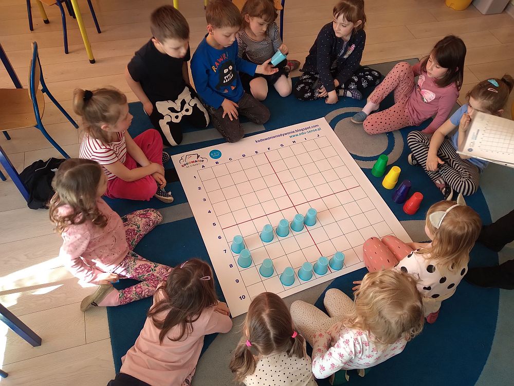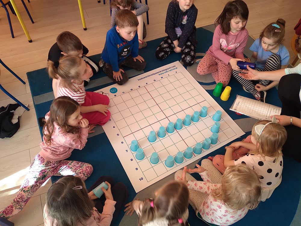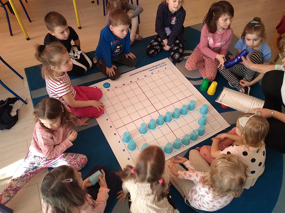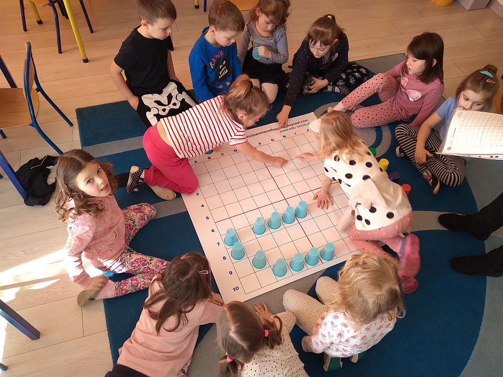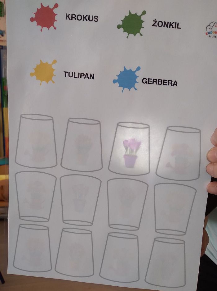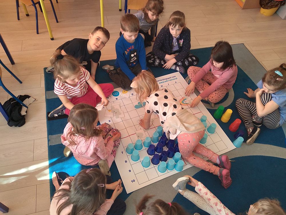 23 marca nasze przedszkolaki kolejny raz powitały wiosnę, tym razem układając wiosenne obrazki na macie do kodowania. Dzieci dzięki tej aktywności utrwaliły poznane litery i liczby, ćwiczyły logiczne myślenie, orientację w przestrzeni oraz uczyły się wytrwałości i współpracy w grupie. Przedszkolaki układały również wieże z kolorowych kubeczków. Podczas tej aktywności zastosowano zabawę z wykorzystaniem latarki. Poprzez Kodowanie na dywanie dzieci powtórzyły informacje dotyczące kwiatów wiosennych i owadów oraz poznały charakterystyczne cechy marcowej pogody. Zapoznały się też z przysłowiami związanymi z tą porą roku. Wszystkie zadania zostały wykonane przez przedszkolaków na medal.