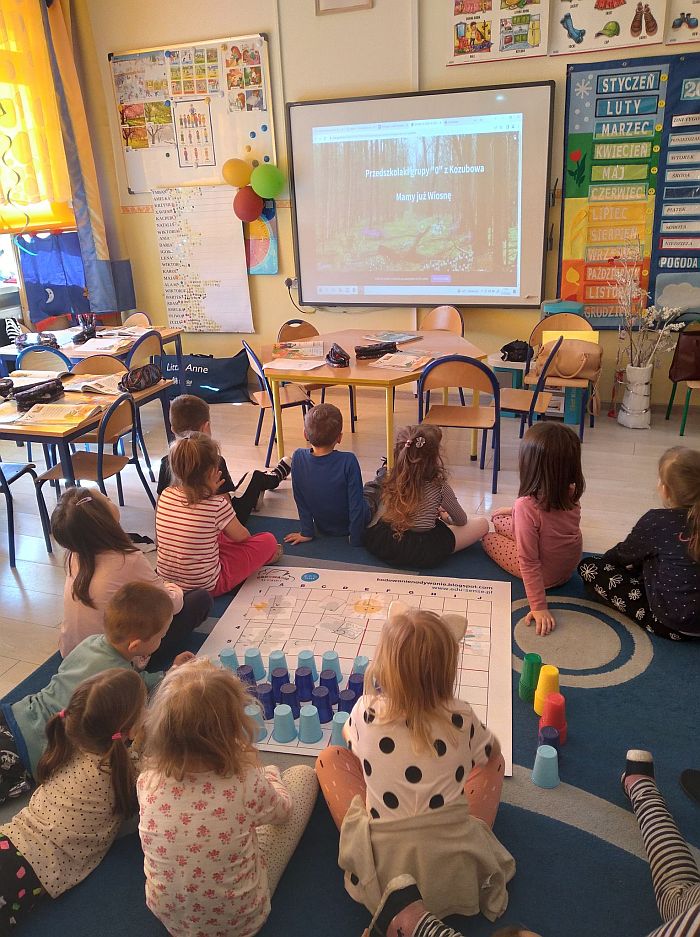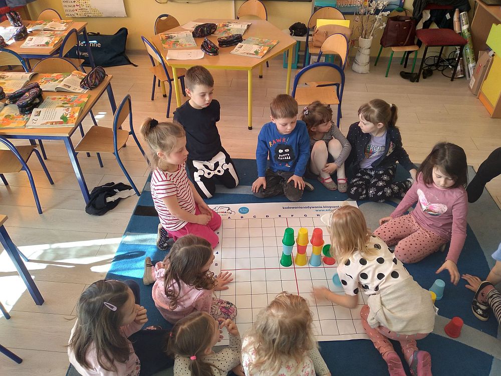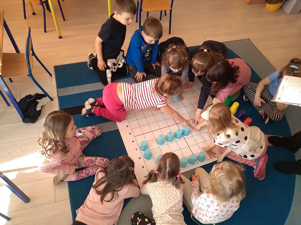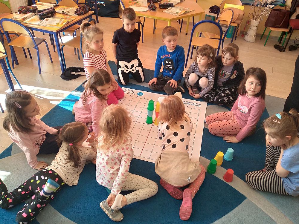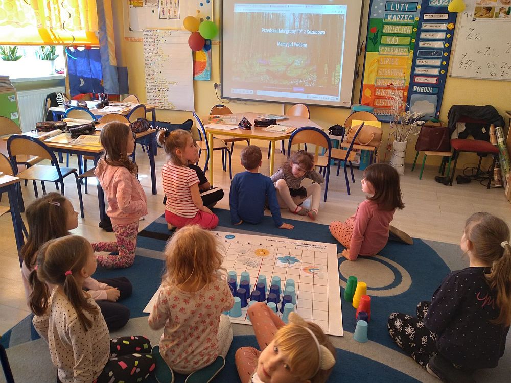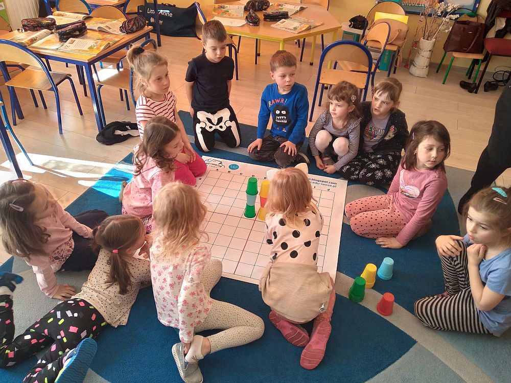 23 marca nasze przedszkolaki kolejny raz powitały wiosnę, tym razem układając wiosenne obrazki na macie do kodowania. Dzieci dzięki tej aktywności utrwaliły poznane litery i liczby, ćwiczyły logiczne myślenie, orientację w przestrzeni oraz uczyły się wytrwałości i współpracy w grupie. Przedszkolaki układały również wieże z kolorowych kubeczków. Podczas tej aktywności zastosowano zabawę z wykorzystaniem latarki. Poprzez Kodowanie na dywanie dzieci powtórzyły informacje dotyczące kwiatów wiosennych i owadów oraz poznały charakterystyczne cechy marcowej pogody. Zapoznały się też z przysłowiami związanymi z tą porą roku. Wszystkie zadania zostały wykonane przez przedszkolaków na medal.