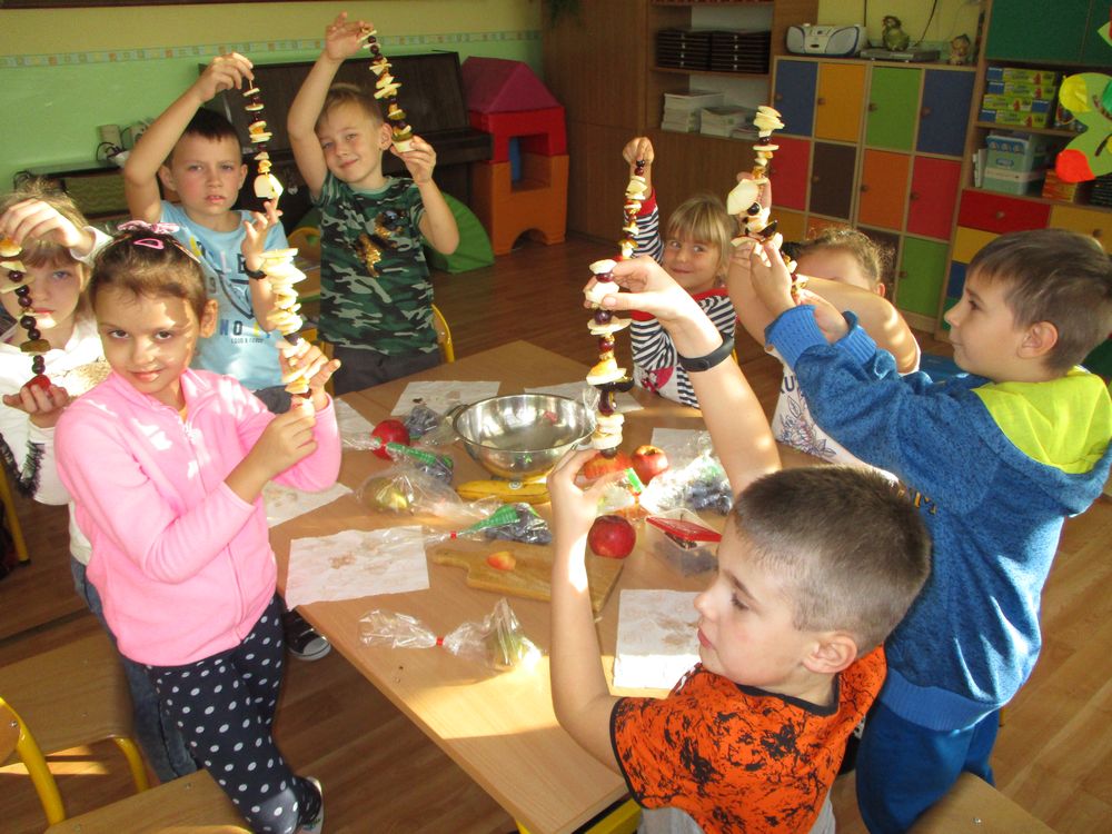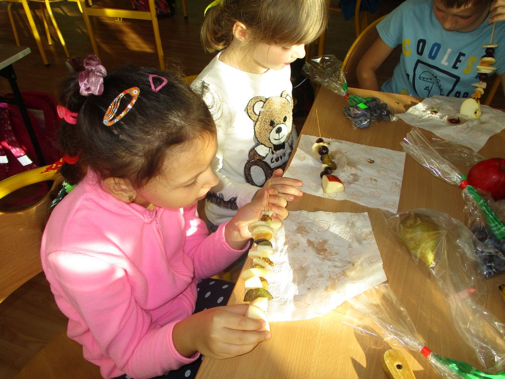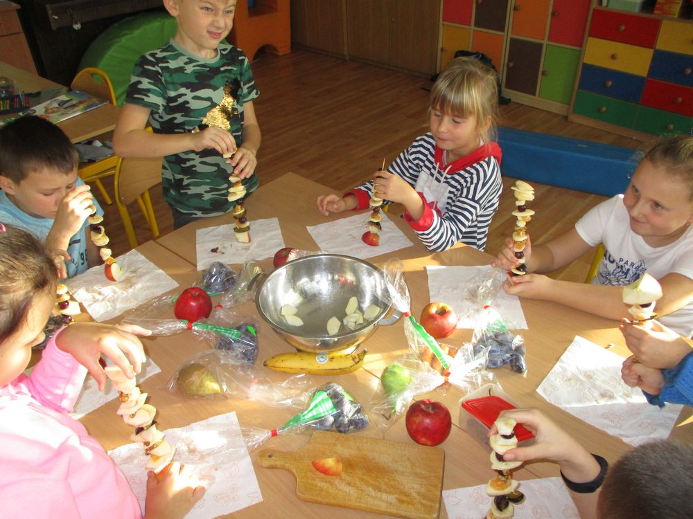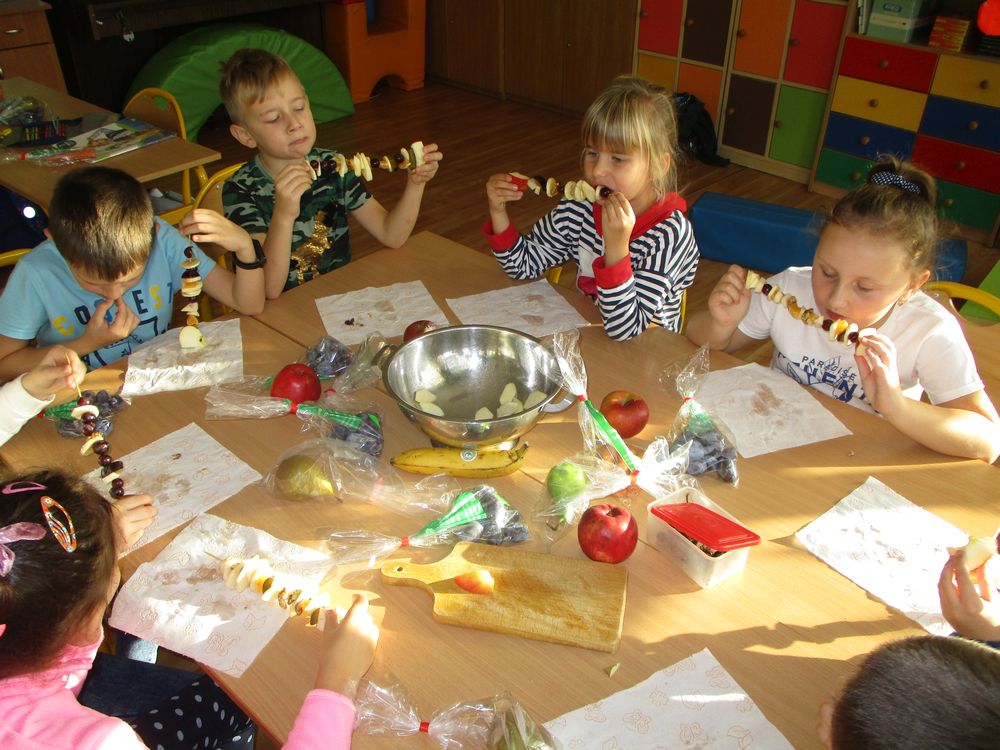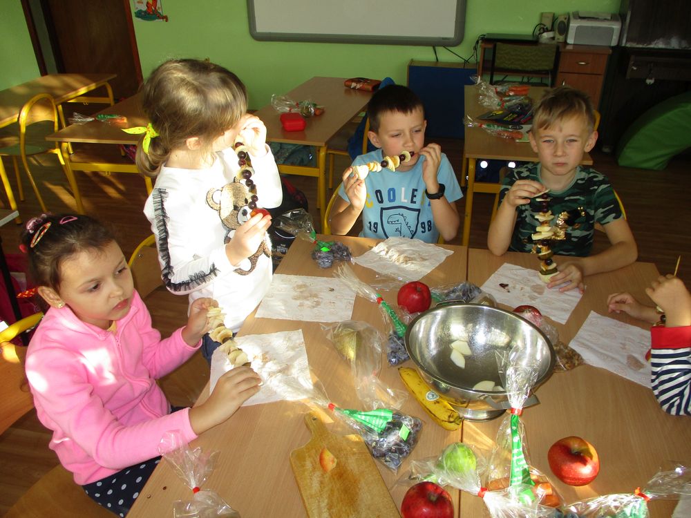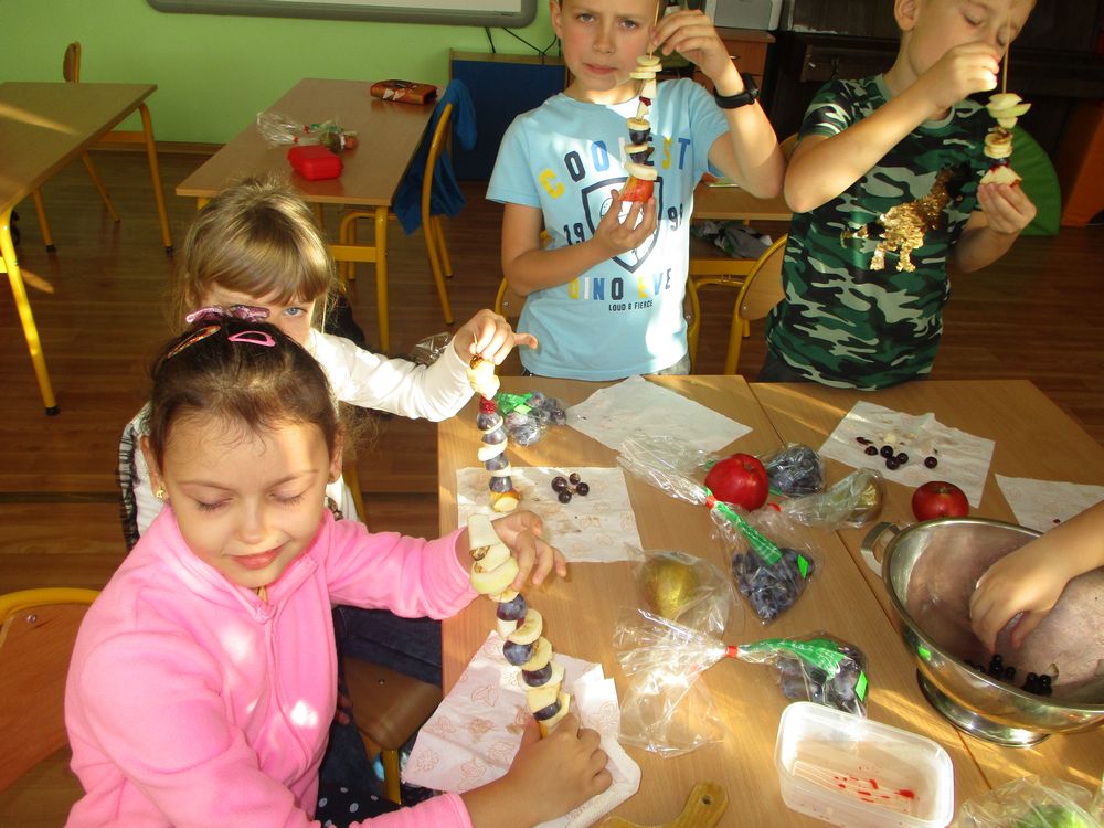 Dzisiaj w klasie 1 było smacznie i przede wszystkim zdrowo! Dzieci na zajęciach własnoręcznie przygotowały pyszne szaszłyki owocowe. Była to świetna okazja do powtórzenia nazw owoców krajowych i egzotycznych, poznania ich zapachów i smaku. Pierwszaki samodzielnie kroiły owoce na kawałki oraz nadziewały na patyczki tworząc pyszne i zdrowe szaszłyki owocowe. Praca zakończyła się degustacją, wszystkie owoce zostały skonsumowane z apetytem. Przygotowanie deseru dało dzieciom wiele satysfakcji jednocześnie uświadamiając jak ważną rolę odgrywają witaminy we właściwym funkcjonowaniu naszego organizmu.